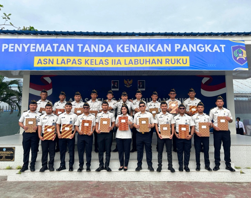 Penyematan tanda kenaikan pangkat dilakukan langsung oleh Kepala Lapas Kelas IIA Labuhan Ruku, Hamdi Hasibuan, dan disaksikan oleh seluruh peserta upacara. Prosesi berjalan dengan tertib dan penuh rasa bangga, mencerminkan semangat kebersamaan serta komitmen dalam meningkatkan profesionalitas di lingkungan masyarakat.