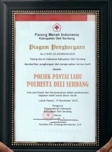 Deli Serdang-Kompasnusa.net//  Polsek Pantai Labu Polresta Deli Serdang menerima Piagam Penghargaan dari Palang Merah Indonesia (PMI) Kabupaten Deli Serdang atas partisipasi dan kerjasamanya dalam pelaksanaan kegiatan bakti sosial donor darah.